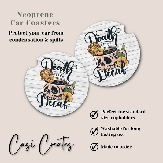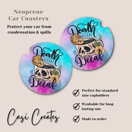 Death Before Decaf - Watercolor Neoprene Car Coaster