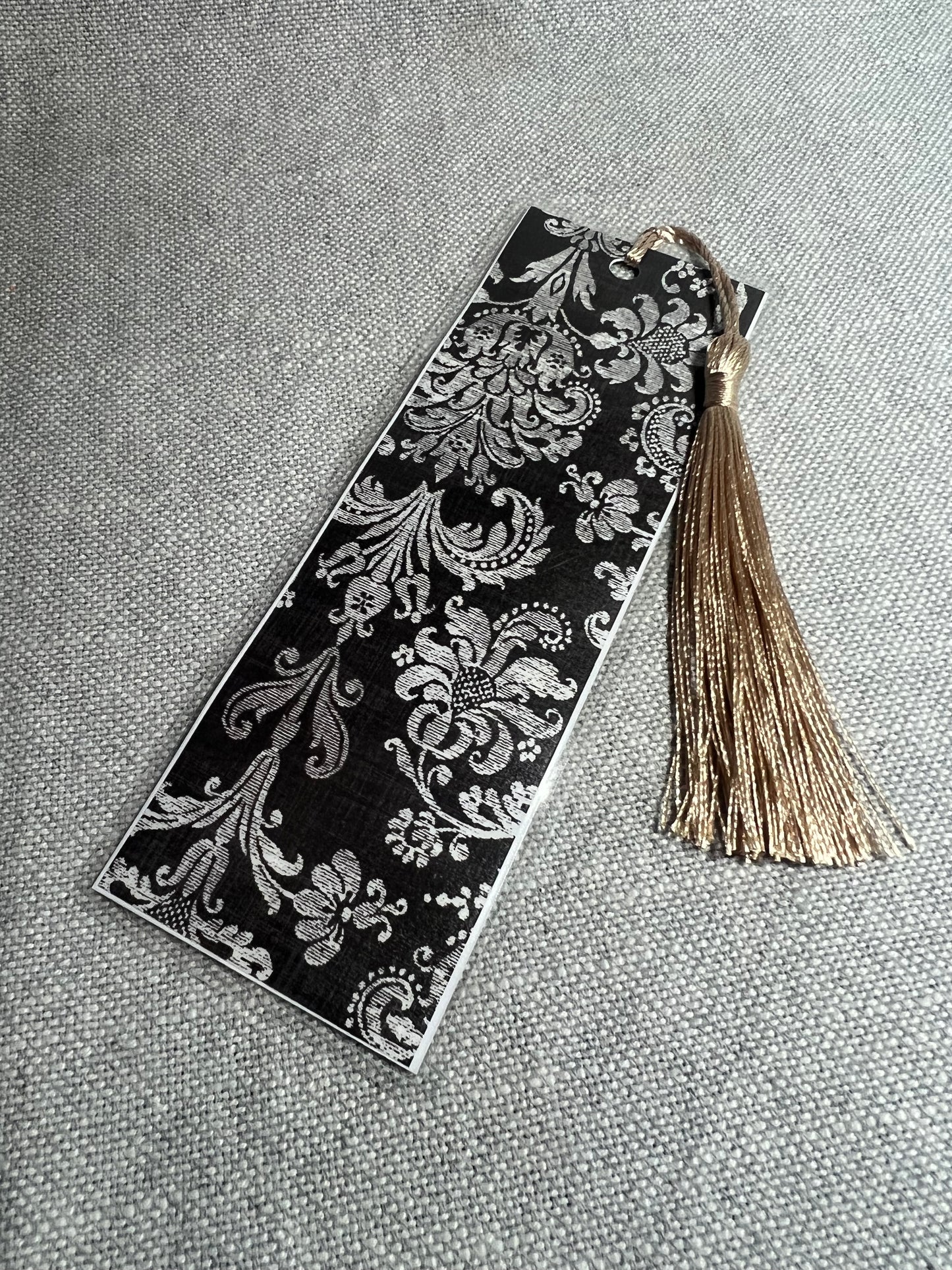 Each bookmark is handmade, featuring double-sided design and a tassel. *Design may vary slightly due to paper cut placement. 2” wide x 6” long pre-lamination.